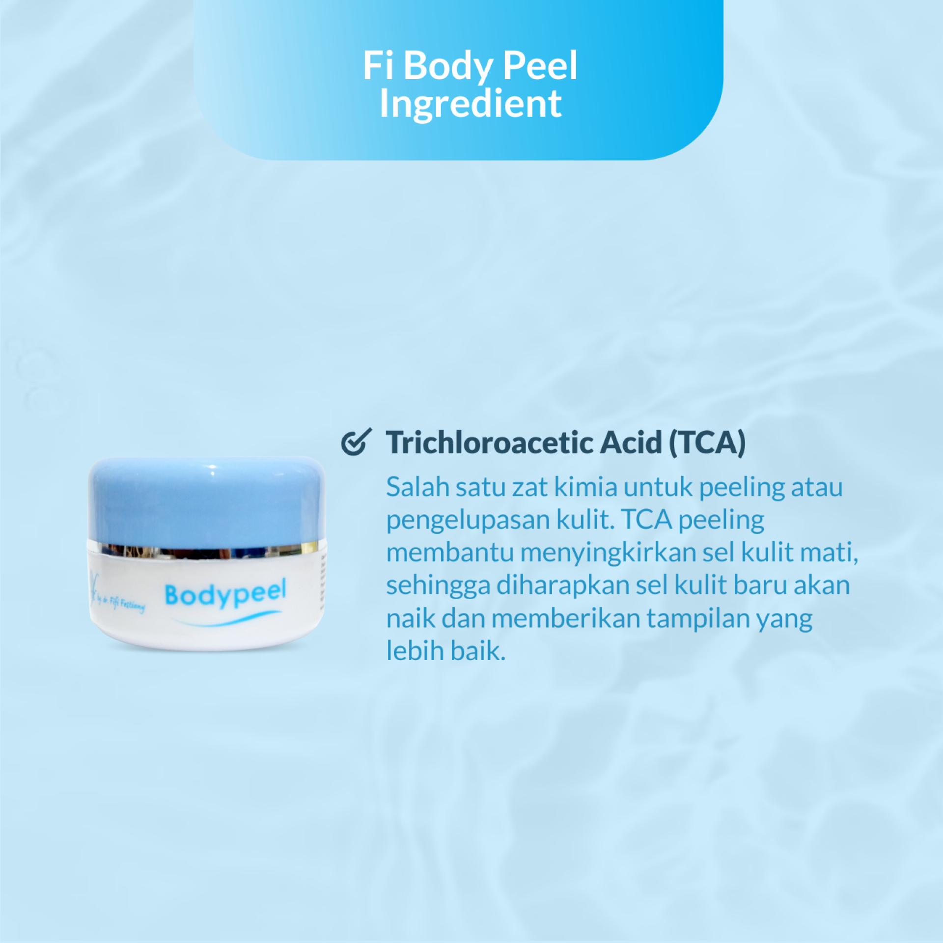 Manfaat Body Peel dengan kandungan Trichloroacetic Acid (TCA) adalah untuk membantu menghilangkan sel kulit mati, dan mempercepat pertumbuhan sel kulit yang baru